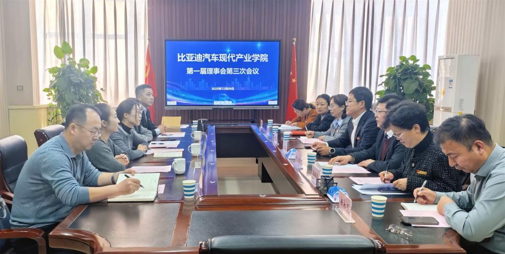 2025年12月9日上午,比亚迪汽车现代产业学院第一届理事会第三次会议在办公楼第二会议室隆重召开。学院党委副书记、院长高晓平、招生就业处处长刘桂花、车辆工程系党总支书记王瑞清、自动化系主任房永亮、车辆工程系主任魏淑娟、教务处副处长韩雪等校方代表与比亚迪人力资源处四部人事总监陈静、太原人事经理卫雅、招聘经理罗雪等企业代表齐聚一堂,共商发展。会议由学院党委委员、组织人事处处长胡明主持。